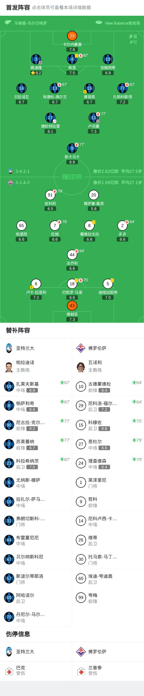 亚特兰大2-0佛罗伦萨,奥迪隆破僵,卢克曼建功